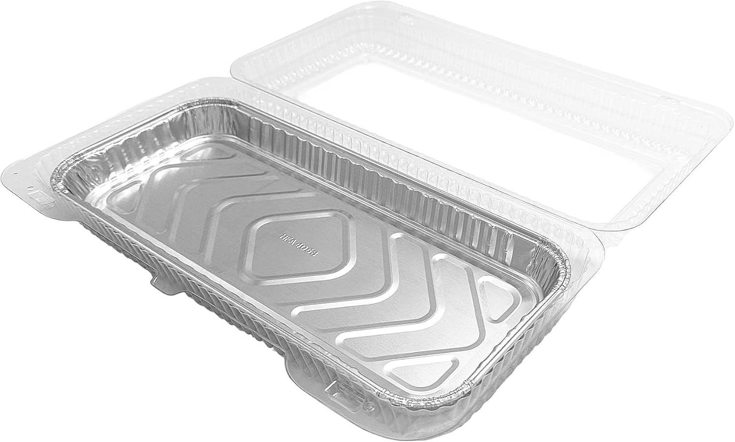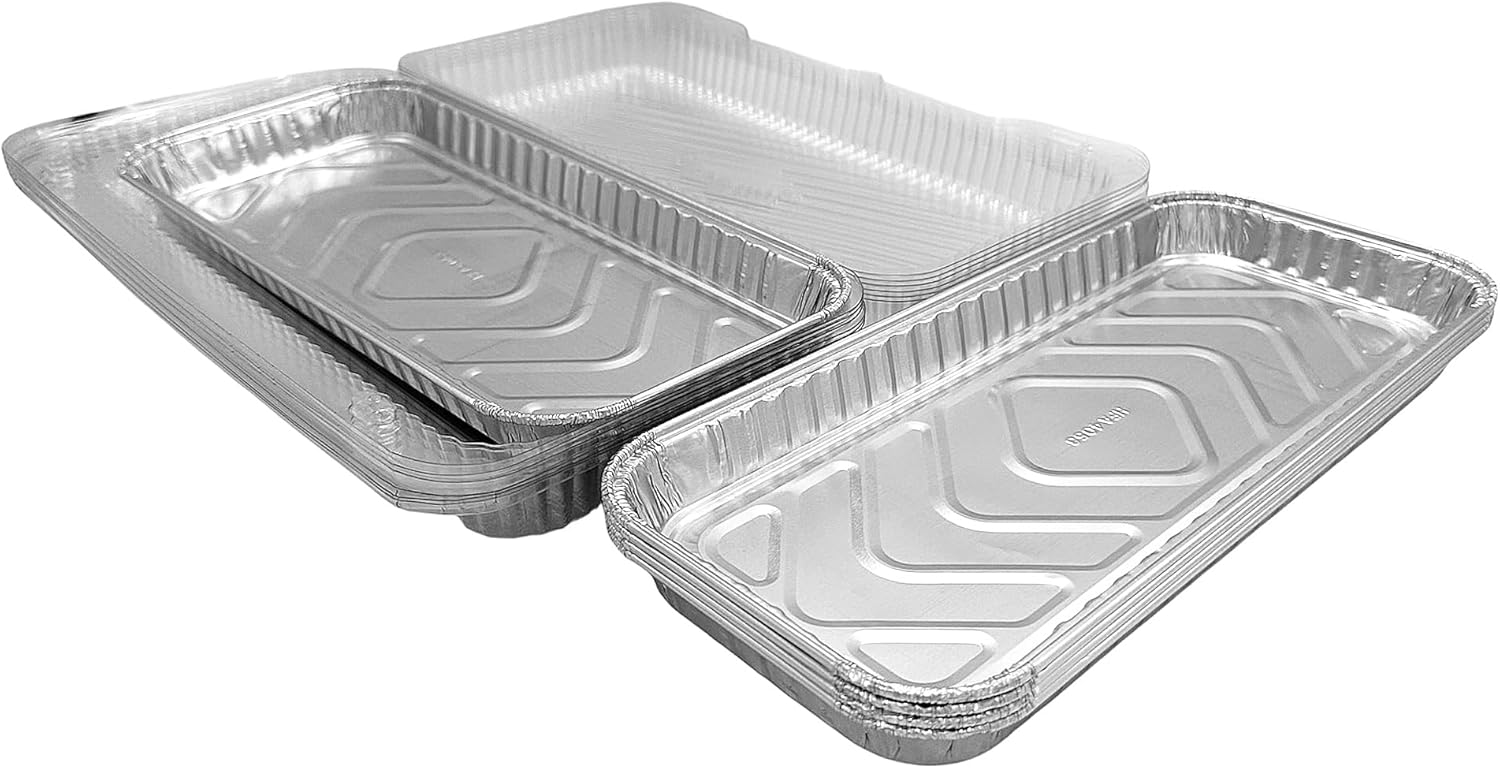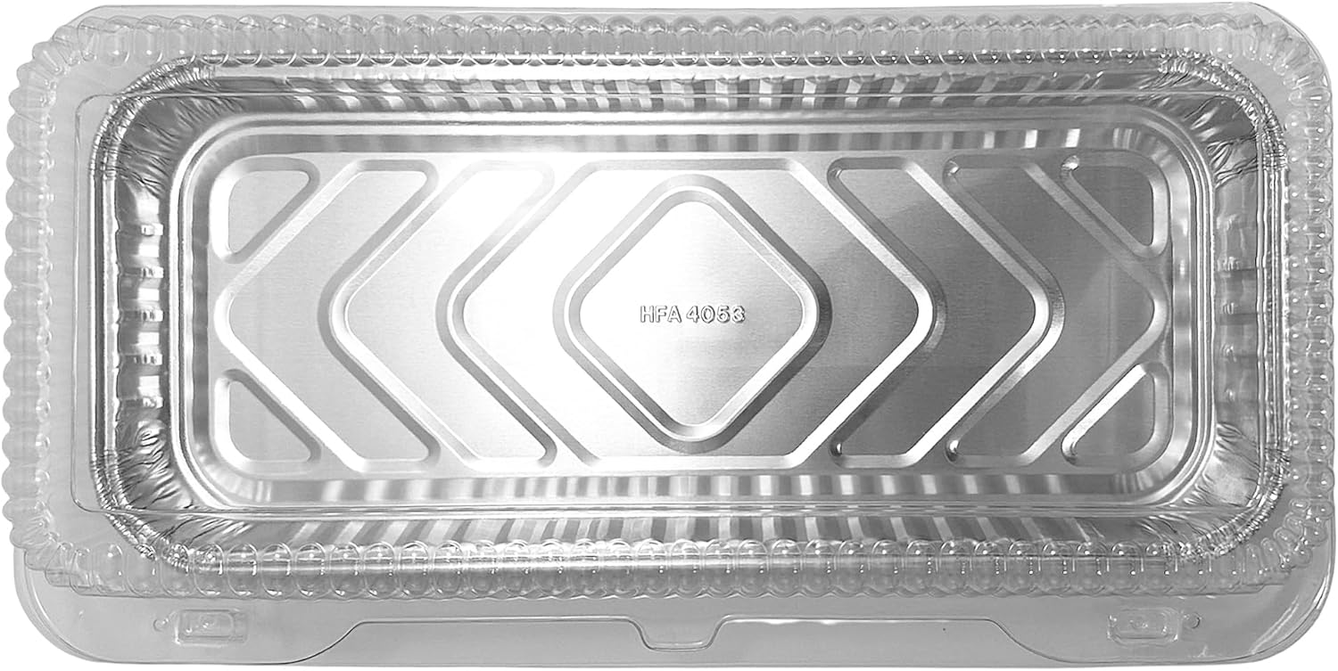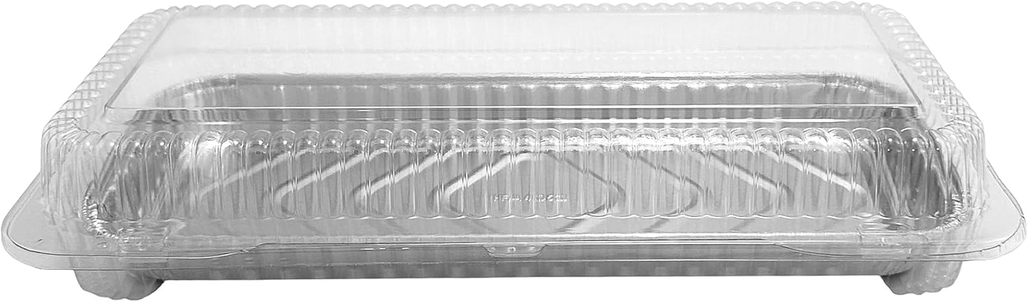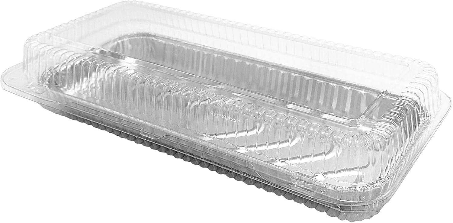 Premium quality Handi-Foil 12" x 5" Oblong Danish Pan w/matching clear plastic hinged lid tray container. 24.5 fl.oz. capacity, approximately 1" deep. These danish pans are ideal for danishes, pastries, sweets, and more. Showcase your danishes in style, and transport them with ease! Pack of 50 danish pans with 50 matching clear hinged containers.